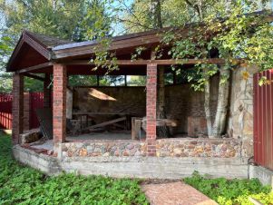 На участке есть зона барбекю на высоком бетонном фундаменте под крышей.
