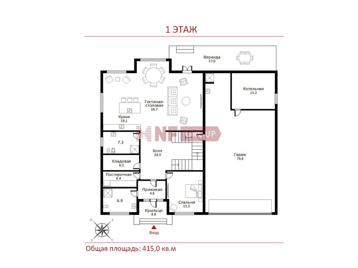 1 этаж: кухня-гостиная с выходом на террасу, спальня, два с/у, гардеробная, постирочная комната, прихожая, большой холл, гараж на 2 авто, котельная;