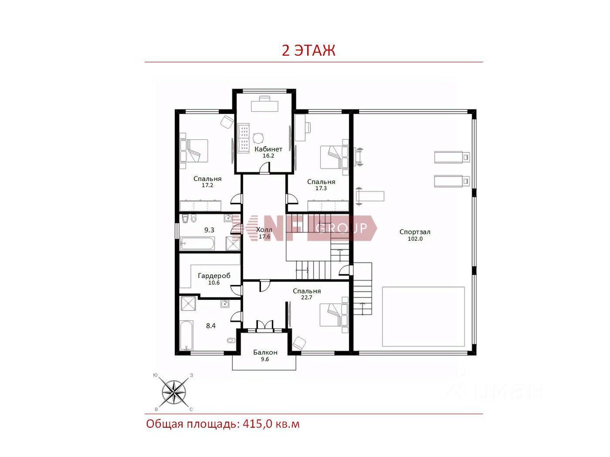 2 этаж: мастер-блок (спальня, гардеробная, ванная комната, выход на балкон), 2 спальни и с/у, кабинет (спальня), спортивный зал 102 кв.м.