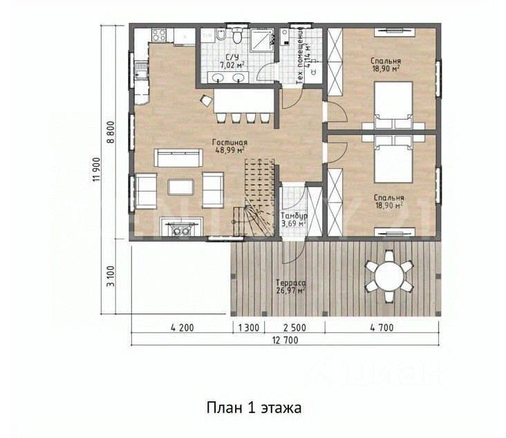 1 этаж - кухня-гостиная с зоной ТВ, две изолированные спальни, санузел с душевой кабиной, котельная и прекрасная терраса под навесом с выходом к зоне барбекю.