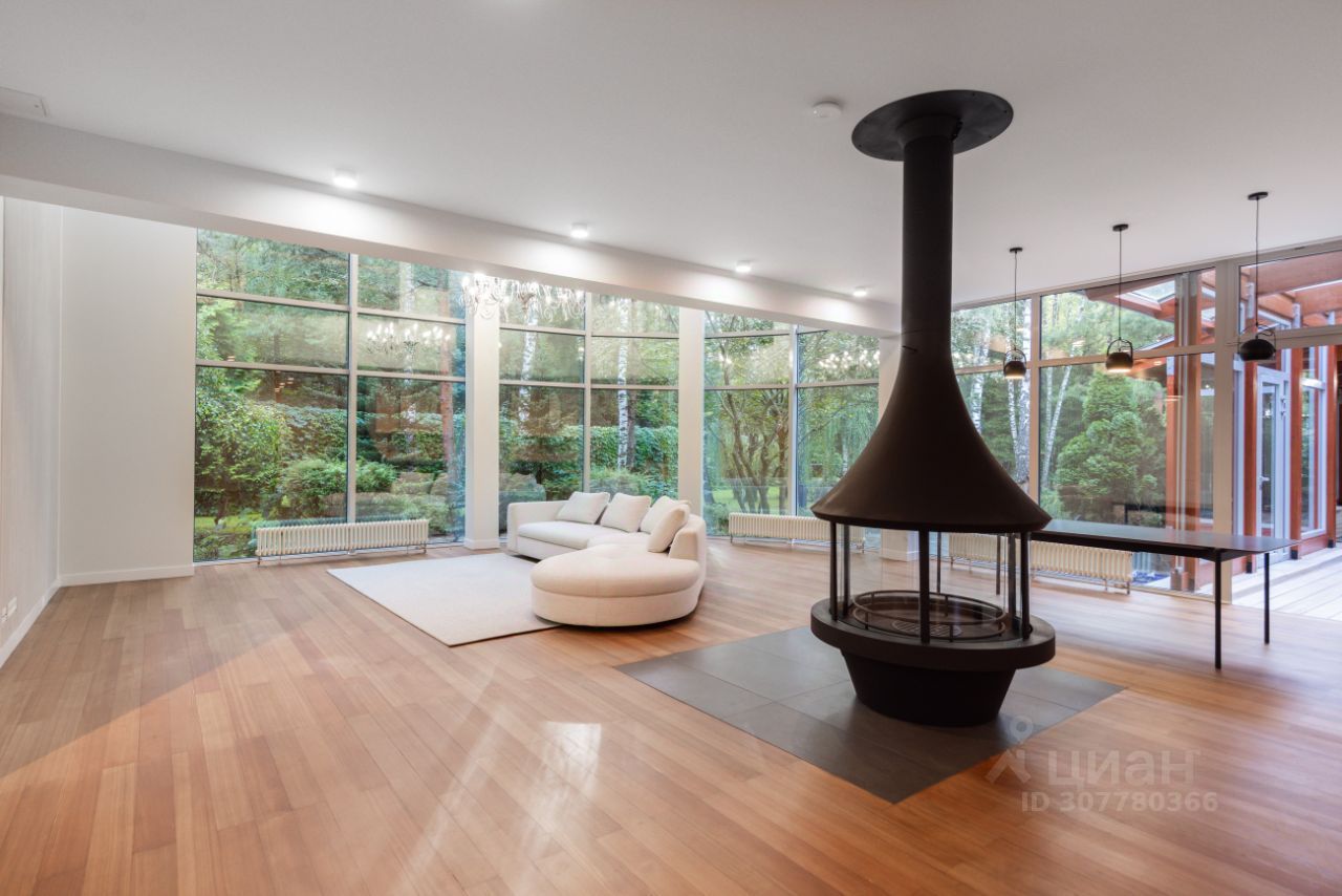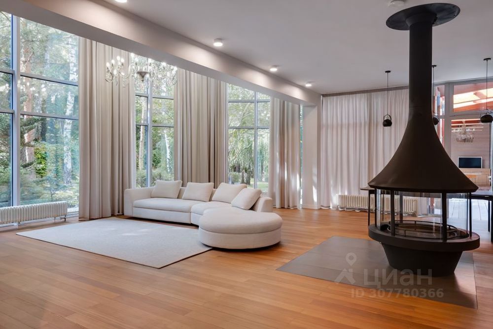 Из огромных окон во всю стену гостиной открывается чудесный вид на собственный лес.