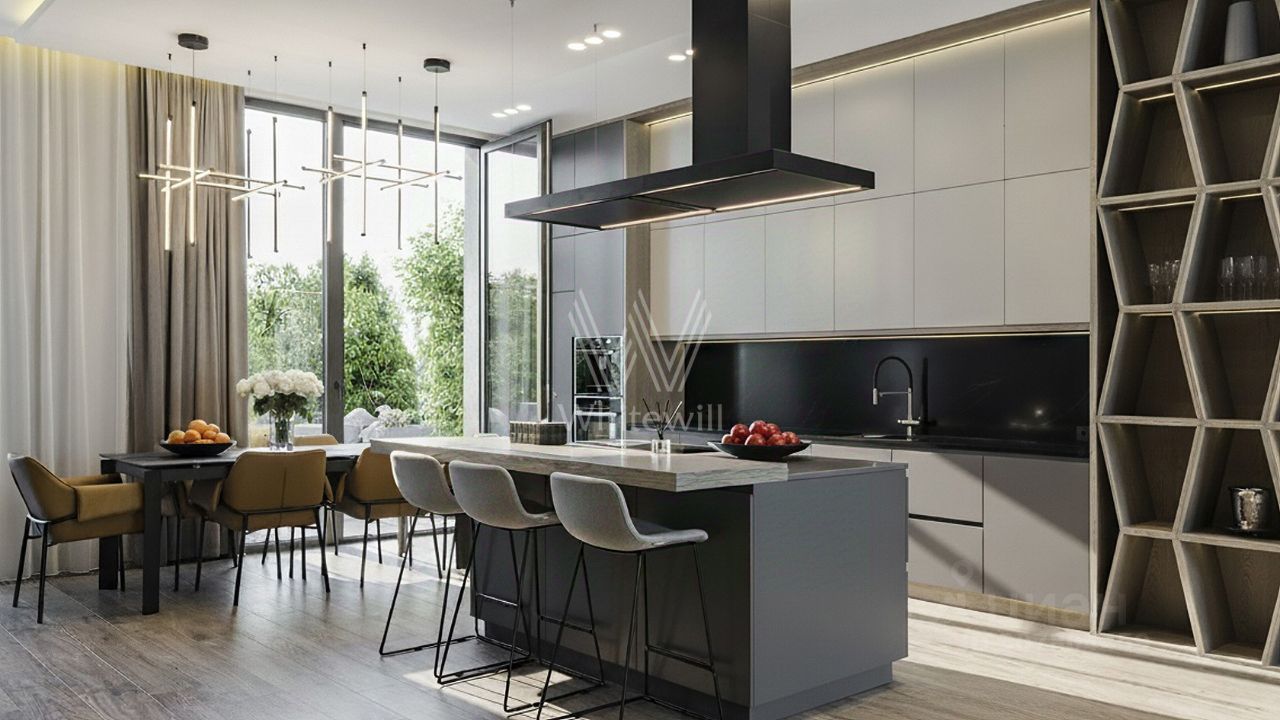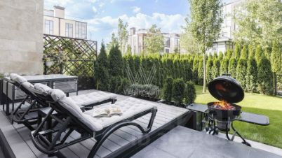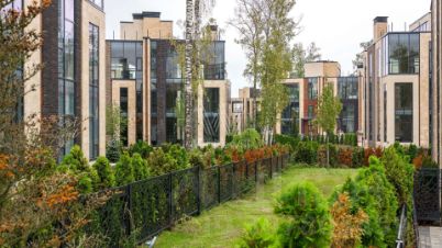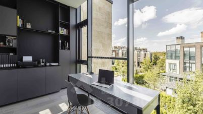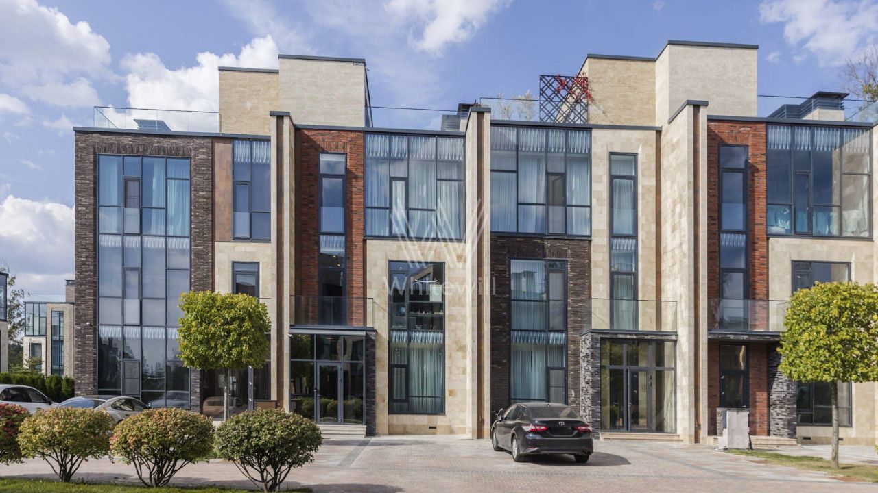 Park Fonte. Трехуровневый таунхаус площадью 278 м² построен на уютном полевом участке 2,2 сотки. Фасад с большой площадью остекления облицевали клинкерным кирпичом и бежевым камнем. В отделке современного интерьера использованы премиальные материалы. Планировка таунхауса включает 3 спальни, кухню-столовую, переходящую в гостиную с камином, функциональный кабинет и просторную террасу. Поддерживать спортивную форму поможет собственный тренажерный зал. Предусмотрен выход на эксплуатируемую крышу, где можно организовать лаунж-зону или место для встреч с друзьями под открытым небом. На участке засеян газон, по периметру высажены высокие туи, создающие атмосферу приватности.