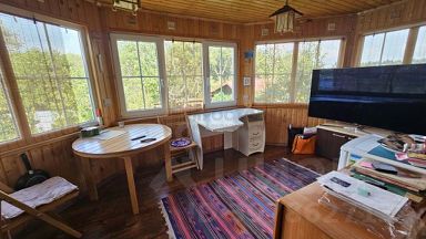О ДОМЕ:: небольшой 2-х эт. уютный домик с хорошим ремонтом, со всей необходимой мебелью и техникой. На первом этаже расположена кухня -гостиная, комната отдыха, санузел и баня. На втором эт. просторная комната с интересной детской-игровой комнаткой. Тех. характеристики: Фундамент ленточный утепленный, есть сухое подвальное помещение. Внешне обшит блокхаусом, ж/б перекрытия, качественные стеклопакеты, крыша покрыта металлочерепицей и оборудована системой слива. Электрический котел с разводкой по дому эффективных радиаторов отопления , а также дополнительное инфракрасное отопление в хозяйской спальне.