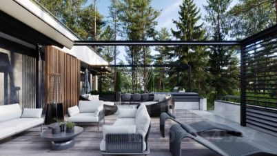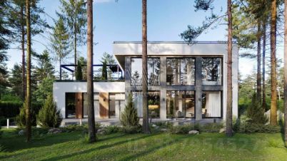 Лесные зори. Загородный дом площадью 549 м² по проекту foster delight max построен на лесном участке 13 соток. Лаконичный фасад с панорамными окнами и плоской кровлей выполнен в современном стиле. В коттедже выполнена отделка whitebox — осталось лишь выбрать финишные покрытия, мебель и текстиль. Из главной спальни можно попасть на просторную террасу 120 м², где приятно проводить время на свежем воздухе. Расслабиться в конце дня можно в сауне и комнате отдыха. В конутре дома расположен гараж на 2 машины. На участке выполнен ландшафтный дизайн, вымощена площадка перед домом и высажены кустарники.