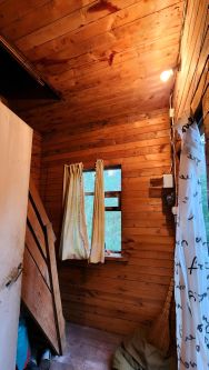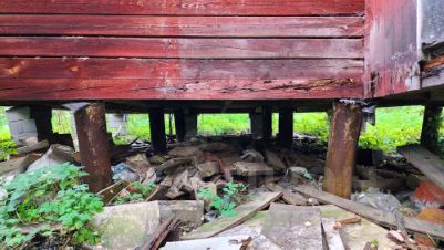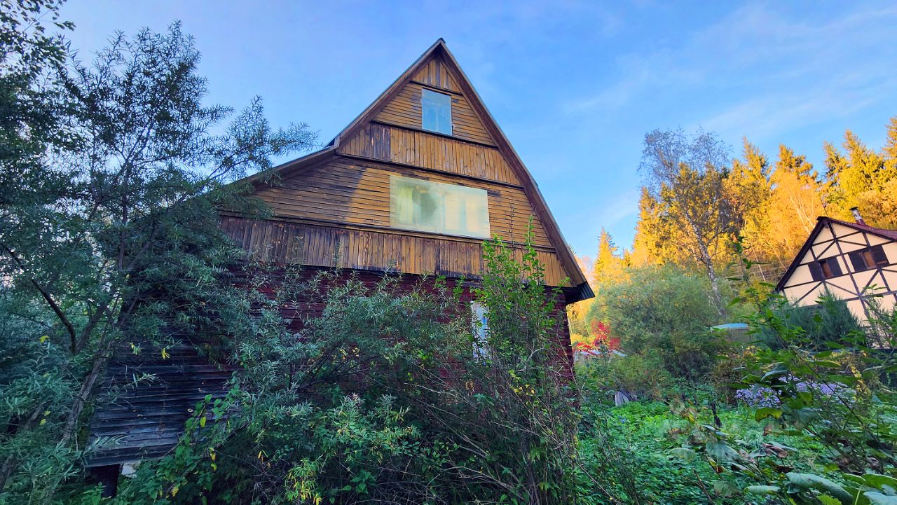 Дом трехэтажный, каркас из бруса, железная крыша, свайный фундамент. Нуждается в замене фундамента, утеплении, покраске, новом крыльце.