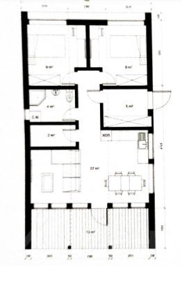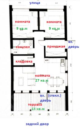 В доме три комнаты (просторная кухня-гостинная и две изолированные спальни), ванная комната (санузел совмещен), небольшая прихожая и комната под хоз.нужды. На одном из фото представлена схема дома (с возможной планировкой мебели). Гостинная комната имеет выход на небольшую уютную террасу, расположенную позади дома, площадью 13 кв.м.