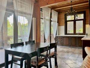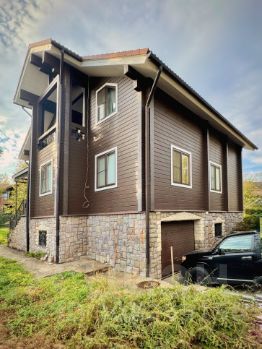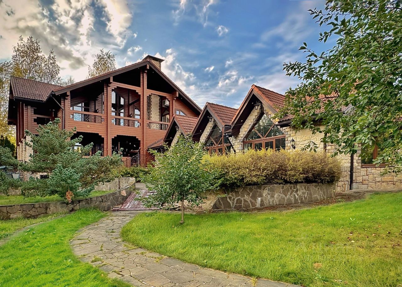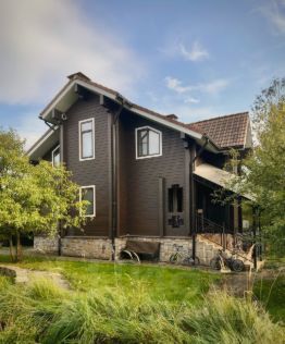 Крыша керамическая черепица, мансардные окна. Стены клееный брус 18х15 см., кирпич, отделанный натуральным камнем. Окна трехкамерные стеклопакеты. Коммуникации: скважина, септик, ливневая канализация, свой генератор на 80 кВт.