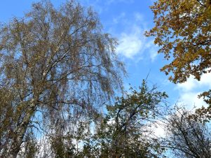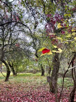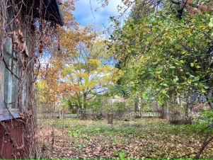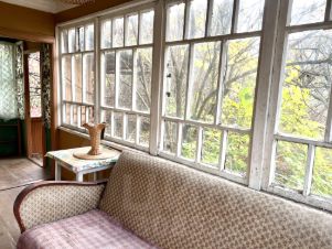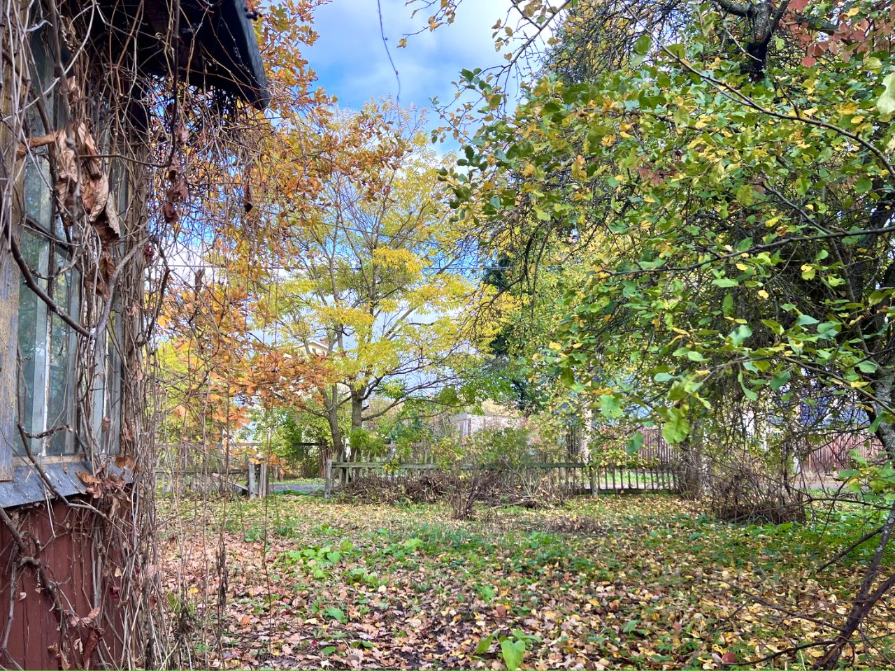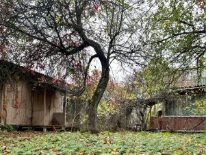 На участке растут молодой дуб, большая берёза, небольшой яблоневый сад и другие плодовые деревья. Рядом с участком растут большие хвойные деревья (видны из окон дачи).