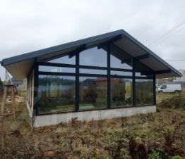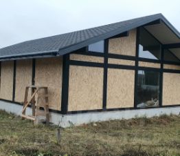 На участке построен дом по технологии фахверк с панорамным остеклением. Несущие столбы и балки изготовлены из клееного конструкционного бруса (сечение несущих столбов 230*230 мм, несущие балки 300*135мм ). Фундамент - плита с ребрами жесткости вниз. Стеклопакеты с мультифункциональными стеклами снаружи, которые обеспечивают отражение ультрафиолетовых лучей, а изнутри энергосберегающие для сохранения тепла. Внутри свободная планировка. Высокие потолки под крушу 5 м. Утепление всего дома запланировано ППУ с перехлестом PIR плитой. Внешняя отделка на выбор, варианты: скандинавская доска, аква панель со декоративной штукатуркой, планкен из лиственницы. Вокруг дома запланирована терраса. В фундамент заложены все коммуникации. Проект дома вышлю по запросу.