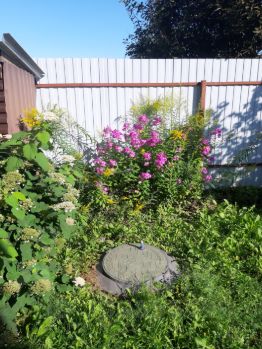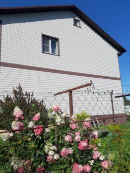 Также имеются плодовые кусты (смородина, крыжовник, жимолость, черноплодка, малина, голубика, фундук), деревья (вишни, черешни, яблони, слива, груши), клубника, декоративные кусты, туи, клумба.