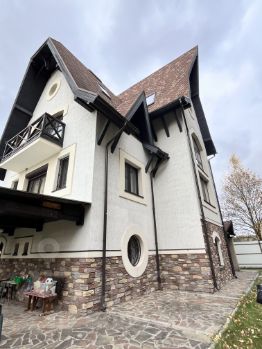 Дом построен в 2008 году по индивидуальному проекту из качественных материалов. Дом монолитно-железобетонный, наружные стены пенобетонные блоки толщиной 400 мм., утепленные пеноплексом (толщиной 50-70 мм) наружная отделка штукатурка типа короед белого цвета. Фундамент ж/б толщиной 400 мм глубиной заложения 1,6 метра. Крыша стропильная, утепленная роквул (толщиной 200-250 мм), покрыта мягкой черепицей на битумной основе (katepal). Внутренняя отделка: стены итальянская штукатурка SanMarco, дикий камень и декоративный кирпич из Германии, на полу итальянская плитка для теплых полов, качественный ламинат. Лестница сделана из массива дерева. Коммуникации в доме: Электричество-15 кВт (380 В); Вода-скважина 90 м; Городская канализация (Договор с водоканалом); Водяное отопление (теплые полы на кухне, столовой, в санузлах), двухконтурный котел Будерос. Окна - ПВХ 2-х камерные энергосберегающим пакеты. В доме на всех этажах, встроенный пылесос Husky (Хаски Америка), не загрязняет воздух в доме, система выводит отработанный воздух на улицу, а мусор собирается в контейнере, установленном в гараже. На первом этаже Дома находится гараж (чистый, сухой) 27,4 кв.м., прихожая, прачечная, холл-прихожая, гардеробная, котельная. На втором этаже: кухня-открытая зона с островом, столовая, гостиная с камином, кабинет, санузел с ванной. На третьем этаже: холл, две спальни с выходом на один балкон, санузел с душевой кабиной, мастер-спальня со своим санузлом и балконом.