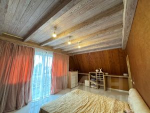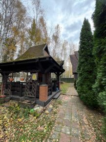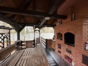 Гостевой дом, построен в 2008 г. площадью 92,9 кв.м. из бруса толщиной 200х200 мм, с утеплением наружных стен роквул 50 мм., обшит деревянной доской под имитацию бруса, пропитан огнебиозащитой. На первом этаже: прихожая, сауна с купелью, санузел, кухня-столовая; на втором две комнаты, гостиная-бильярд.
