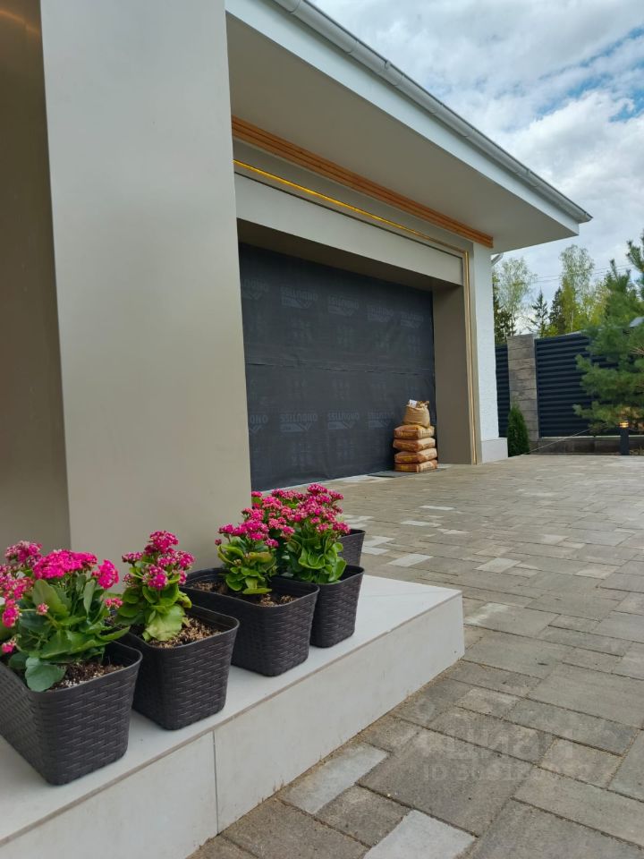 - Фасад дома выполнен в стиле РАЙТ, облицован белоснежной перлитовой штукатуркой и декорирован крупноформатным керамогранитом и фактурной доской в светлом варианте;