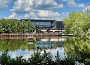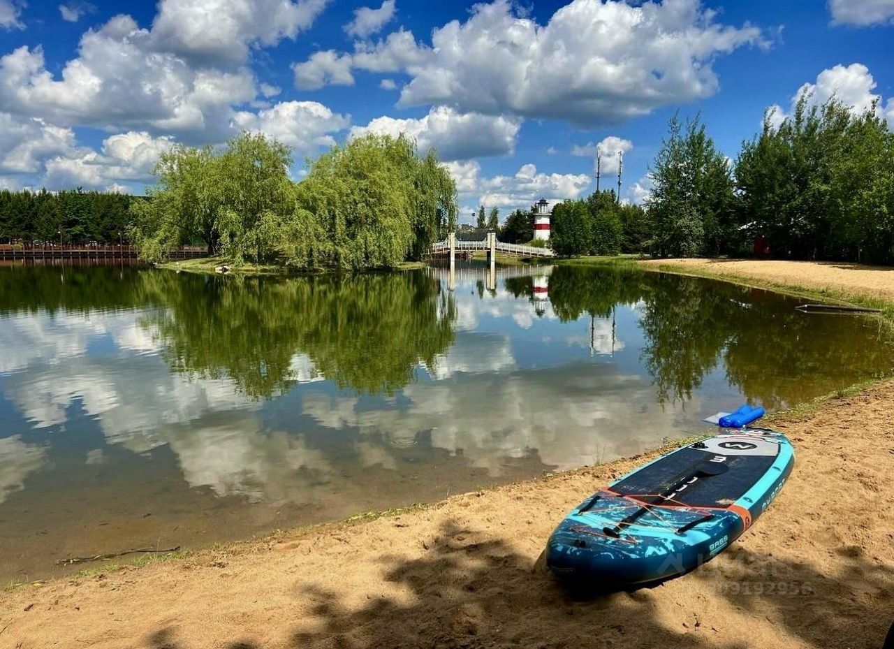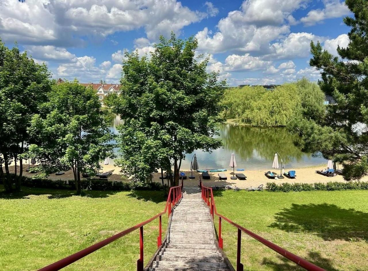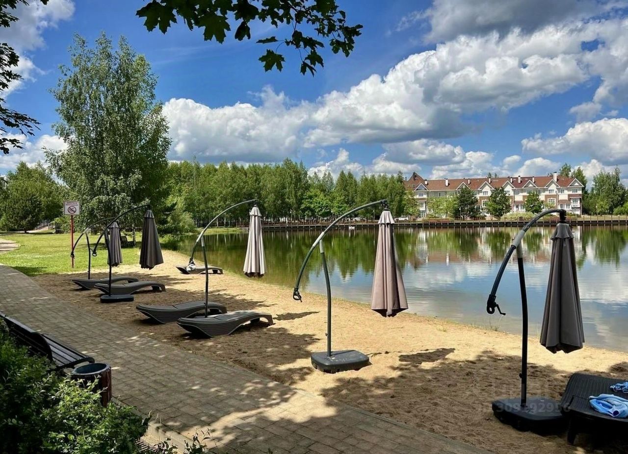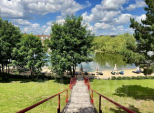 - Озеро с пляжной зоной, оборудованной шезлонгами.