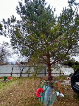Забор по периметру участка с распашными воротами. Посажен газон, выложены дорожки из плитки, растут цветы, туи, сосна, малина, смородина, клубника, вишня, слива, яблони, груши, виноград.