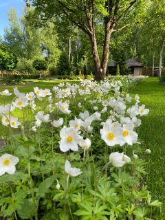 Кроме коттеджа на участке расположен двухэтажный гостевой дом площадью 107 кв.м, совмещённый с тёплым гаражом на 2 машины и помещением для хранения инвентаря (газонокосилки, велосипедов, инструментов и т.п.), летний уютный домик с камином (21 кв.м), летняя беседка, тандыр и мангал с дровницей под крышей. Центр участка украшает красивый, огромный многовековой дуб. Вокруг дома много взрослых лесных деревьев (берёзы, осины, сосны и ели, липы и клёны), выполнен ландшафтный дизайн. В саду большое количество яблонь, груш, кустов смородины, крыжовника и сирени.