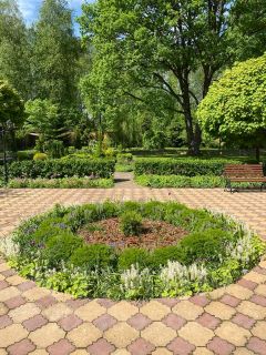Фасад дома украшают 4 уникальных шаровидных клёна.