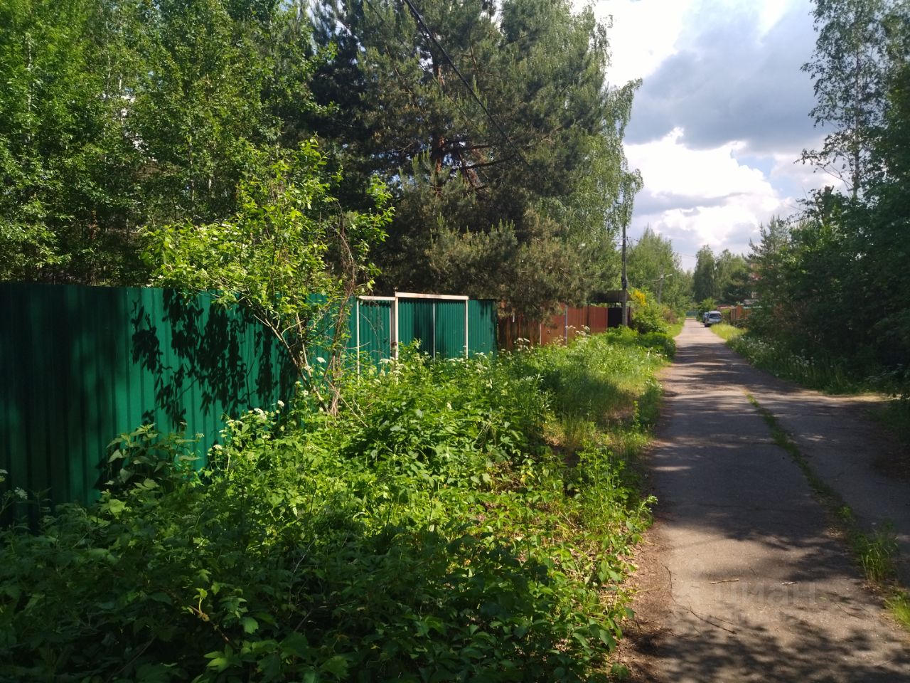 Участок 7,6 соток, 19 х 40 м по периметру, огорожен забором с лицевой стороны из металлопрофиля с калиткой и распашными воротами.