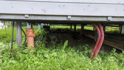 Снаружи дом обшит имитацией бруса, под домом установлена сетка от грызунов.
