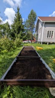 Сделала большая парковочная зона. Территория выровнена и засеяна газоном, растут плодовые кустарники и деревья, поставлены высокие грядки. Есть бытовка для разных мелочей.