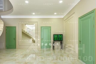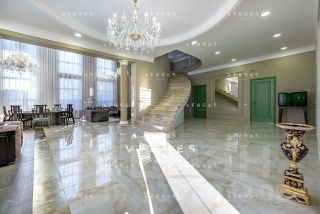 На первом этаже теплые полы с керамогранитным покрытием из Индии. Лестница на второй этаж из мрамора.