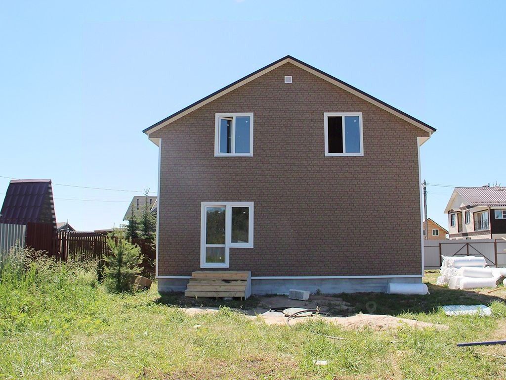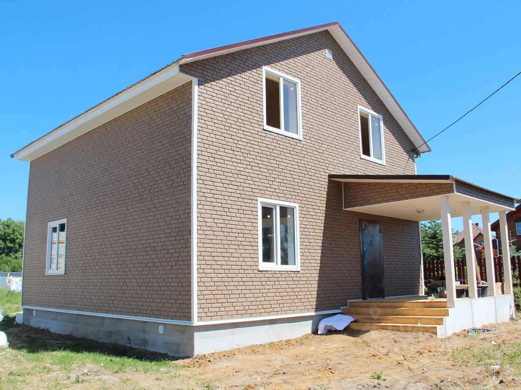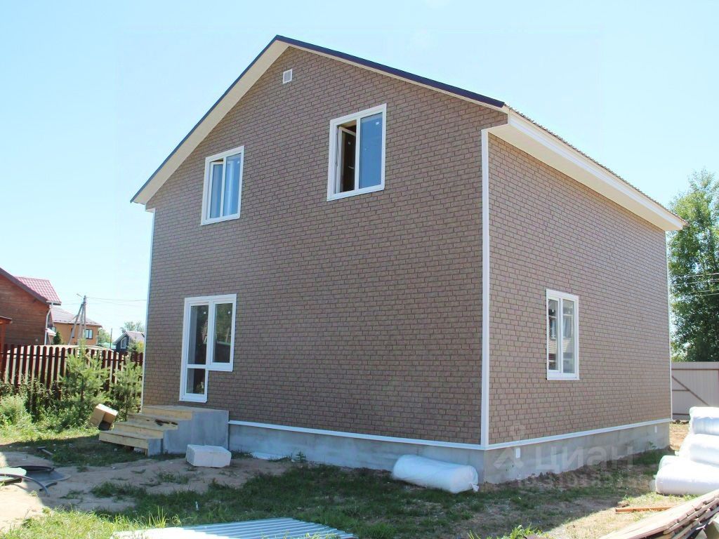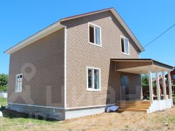 Построен из газосиликатных блоков, снаружи обшит сайдингом. Окна стеклопакеты, крыша металлочерепица. На полу ламинат, линолеум. Дом полностью отделан и готов к проживанию. 1 этаж: прихожая, кухня-гостиная, спальня, санузел, бойлерная. 2 этаж: 3 спальни, холл, санузел.Коммуникации: электричество 380 В (15кВт), водоснабжение - скважина, канализация - септик.