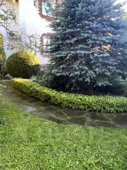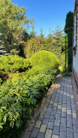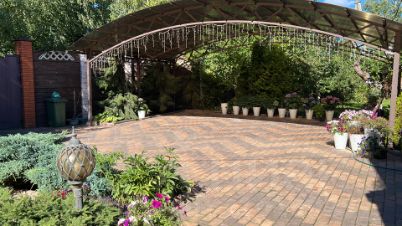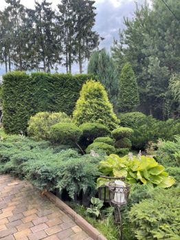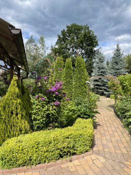 Красивый ландшафтный дизайн во двое, ухоженные растения , есть садовые деревья и кустарники , качели, две беседки открытые