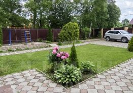 На участке сделан ландшафтный дизайн с дорожками, зонами отдыха.