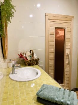 2 этаж: три спальные комнаты (27,5 м2, 21м2 и 15м2), санузел 7,5м2 с сауной 5,2м2 (электрическая печь каменка ).