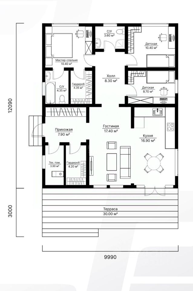 Планировка для всей семьи: гардеробная, три изолированные комнаты, включая мастер-спальню, и просторная кухня-гостиная для уютных семейных вечеров.