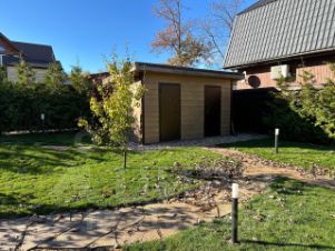 Участок 15 соток с деревьями, благоустроен по индивидуальному проекту ландшафтного дизайна, автополив и красивая подсветка участка и дома.