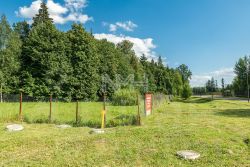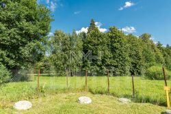 ровный, правильной формы, с лесными деревьями, выполнено ограждение.