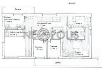 2 этаж: коридор, лестничный холл, мастер спальня с гардеробной и ванной комнатой и выходом на балкон, 2 спальни с выходами на балкон, библиотека со вторым светом, кабинет, гардеробная, санузел.