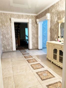 В доме на первом этаже стены оштукатурены и покрашены, на полу уложена плитка. Пол с подогревом по всему первому этажу. В санузле отделка стен и пола - плитка, в бане - вагонка. На втором этаже на полу - ламинат, стены оклеены дизайнерскими обоями. В санузле стены и пол также отделаны плиткой. Везде смонтированы натяжные потолки.