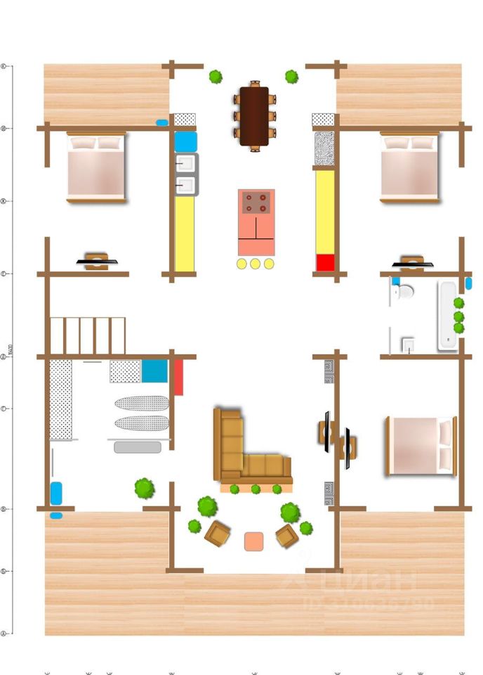 В основном доме имеется 4 готовых спальни - 3 на первом этаже по 15 кв.м. и мастер-спальня 20 кв.м. с гардеробной и хозяйской ванной комнатами по 12 кв.м. каждая. Общее пространство дома представляет собой гостиную и зону кухни-столовой, площадью 16 на 5 метров. Имеется 2 зоны хранения и постирочная на первом этаже, а также санузел с ванной-купелью, оснащенной гидромассажем. На 2 этаже есть также 2 кабинета по 15 кв.м. (можно использовать как спальни), с балконами и выход в зимний сад площадью 50 кв.м. Имеются 2 мастерские для хобби хозяина и хозяйки. Установлены 2 мансардных окна в кровле, одно из которых люк для выхода на кровлю.