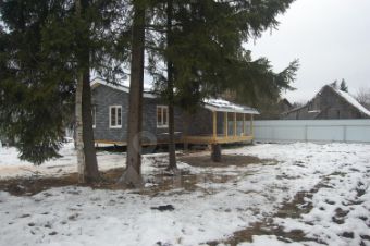 Выполнен из современных сип панелей (без содержания фенола!, не горючий пенопласт). При строительстве дома использовался сухой, калиброванный, строганный пиломатериал, пропитанный антисептиком. Дом стоит на 32х сваях длиной 3м. Пол - толщина панели 224мм, внешние стены и межэтажное перекрытие 174мм, внутренние перегородки из панелей 124мм. В доме установлены качественные окна Rehau и тёплая уличная металлическая дверь для загородного дома с терморазрывом. Крыша металлочерепица GrandLine цвет мокрый асфальт, с двух сторон установлено снегоудержание. Внешняя отделка Хауберк.