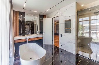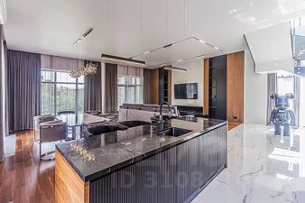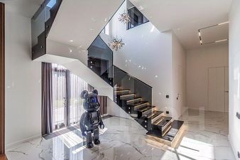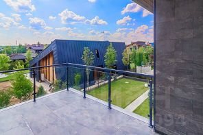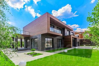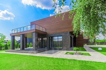 Фасад дома выполнен из лиственницы высокого класса и керамогранита, что обеспечивает тепло- и влагоустойчивость, не требует ухода и сохраняет архитектурную эстетику надолго. Все ванные комнаты оборудованы сантехникой Villeroy & Boch, установлены тёплые полы, керамогранит и натуральный ореховый паркет. Участок озеленён, установлена система автополива.
