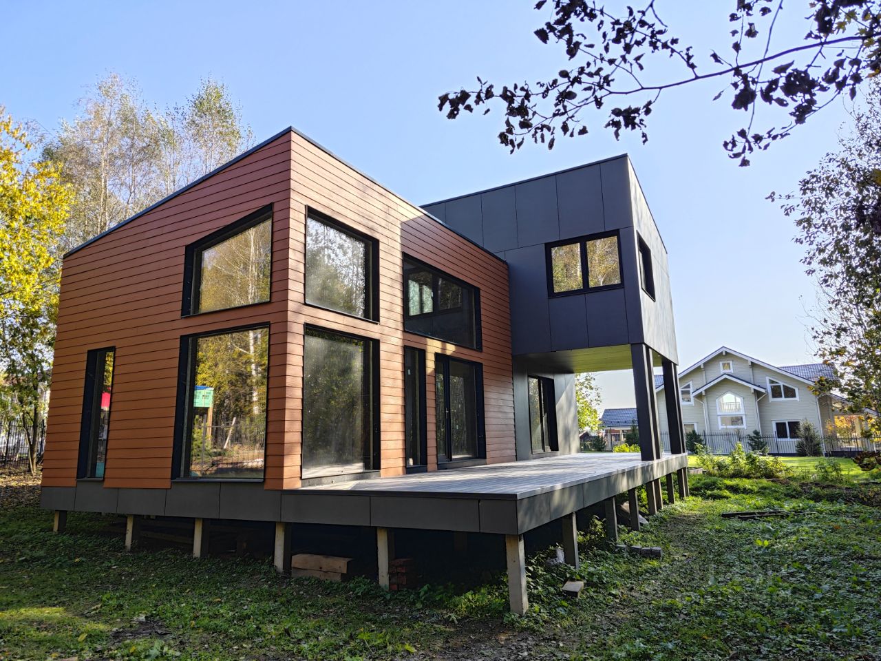 В доме 4 спальни, 3 санузла, котельная, кухня-гостиная с панорамным остеклением и потолками 5 метров, а также выходом на большую террасу с видом на лес.