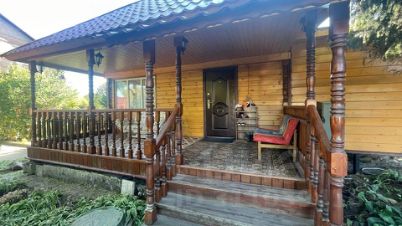Первый этаж - сруб, второй - утепленный каркасный, есть чердак с удобной раскладной лестницей. Крыши - металлочерепица. На первом этаже расположена гостиная с камином, спальня, кабинет, санузлы и кухни. На втором этаже - 3 спальни. К дому примыкает просторная открытая веранда в тени елей и туй.