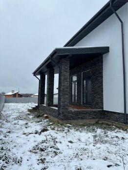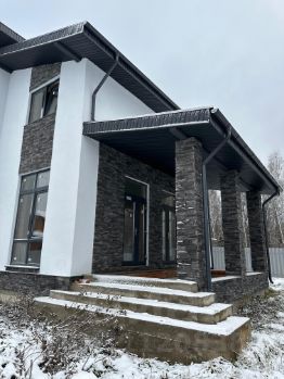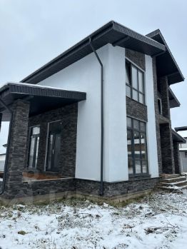 На доме выполнены работы по фасадам в прекрасном цветовом исполнении с использованием качественной декоративной штукатурки Ceresit и искусственного камня White Hills.