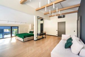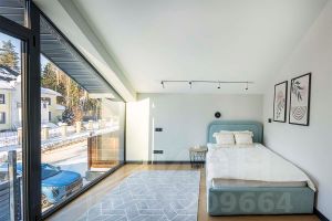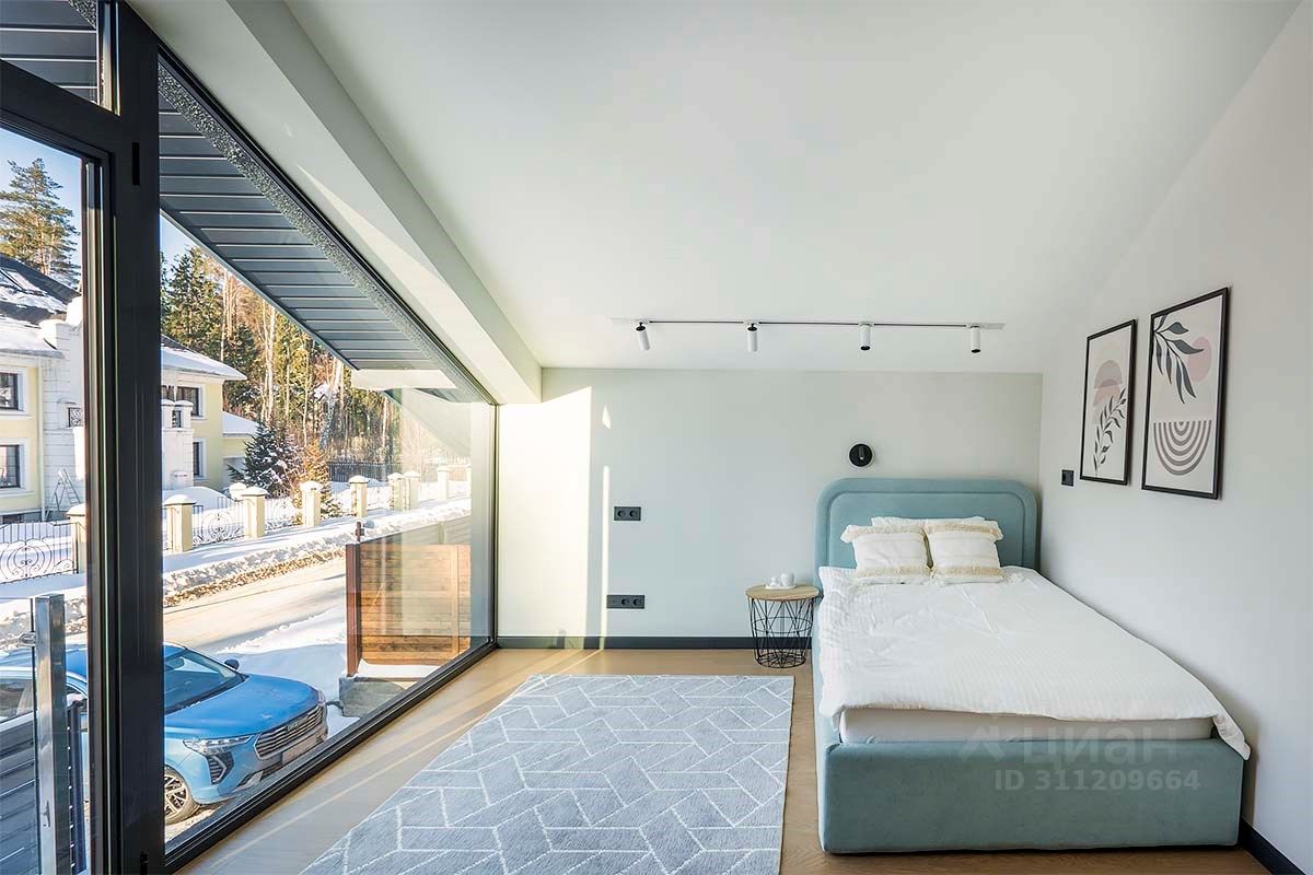 2-этаж: холл, 2 спальни с панорамным остеклением с которых предусмотрен выход на большой балкон, санузел, спальня, просторная мастер-спальня с панорамным остеклением и видом на лес (высота потолков в верхней точке, порядка 5м.) + гардеробная + с/у.