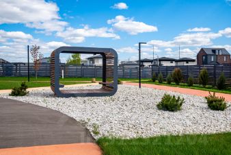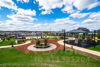 2 этаж - мастер-спальня с персональной гардеробной и окном, вид на центральную часть кп с хвойниками, ландшафтным дизайном, обустроенной огромной спортивно-игровой зоной и парком