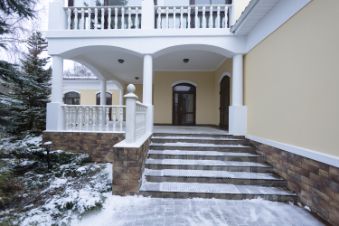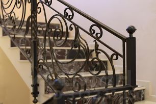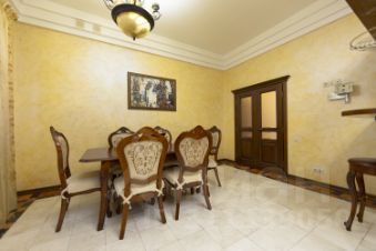 Полы на первом уровне из натурального мрамора, на втором уровне паркетная доска. Лестница с перилами художественной ковки выполнена также из мрамора, специально привезенного из Турции. Дверные проемы, двери и кухня из натурального дуба.