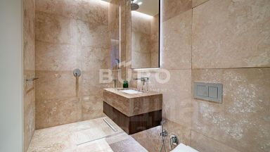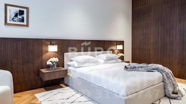 В доме выполнен ремонт в современном минималистичном стиле с применением премиальных материалов, в том числе инженерной доски (ёлочкой) "Finex". В отделке в большом количестве использован натуральный травертин, известный своей прочностью и долговечностью еще с Древних времен.