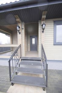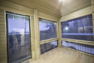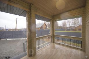 Терраса с мягкими ПВХ окнами в пол (защита от ветра, снега, дождя и холода, очень комфортно), металлическое ограждение, полы из доски палубной, потолок ломаный, обшит планкеном, высота потолков террасы 3-4м