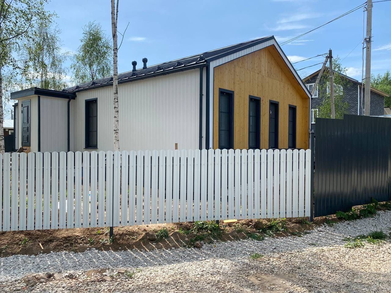 Стены покрашены. На участке организована место для парковки двух автомобилей.