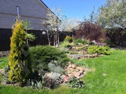 Ухоженный ровный участок 10 соток, правильной прямоугольной формы, полностью облагорожен, произрастают плодово- ягодные деревья и кустарники (черешни, вишни, груши, яблоки, абрикос, сливы, смородина, крыжовник). Есть небольшой огород с парником. Участок огорожен капитальным забором из профнастила с кирпичными столбами. В цокольном этаж расположена котельная.