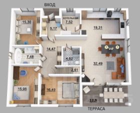 Котельная 7,5м2 соединена с прихожей и кухней, можно сразу занести сумки (не ходить через дом) + место для стеллажа до потолка с доступом из кухни и для стиральной машины