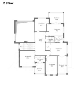 На первом этаже расположены: просторная гостиная со вторым светом и лаундж зоной с камином, высота потолка в зоне второго света девять метров, кухня и столовая с выходом на летнюю террасу, кабинет и спальня. На втором этаже расположены: две мастер-спальни с выходами на балкон и в зимний сад, детская игровая комната, две гостевые спальни.