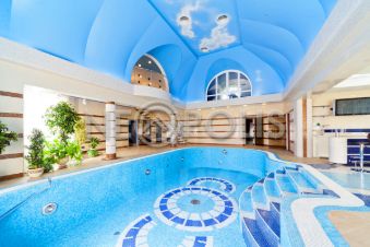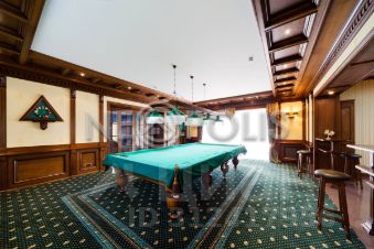1 этаж: холл с парадной лестницей, лифтом, гардеробной и выходом в сад, кухня-столовая, каминный зал, гостиная, кабинет, бильярдная с выходом в сад, SPA зона: хамам, финская сауна, раздевалка, санузел с душевыми; постирочная, бойлерная, гараж на 3 авто с квартирой для персонала на втором этаже (с отдельным входом).